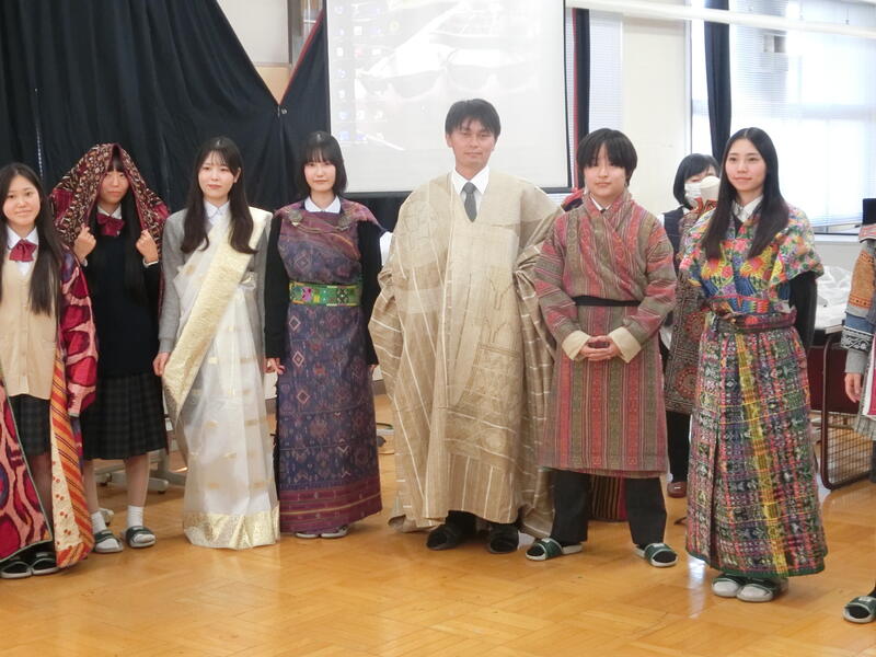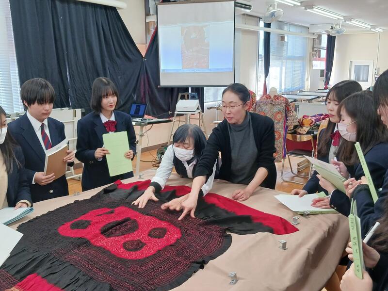 歴史やデザイン、技法などのお話を聞きながら、たくさん持ってきていただいた貴重な民族衣装の数々を実際に手に取ってみることができる授業です。そして最後は、世界各国の本物の民族衣装の着装体験もできるという、染織を学ぶ生徒だけの、多分一生に一度しかない素晴らしい体験でした。