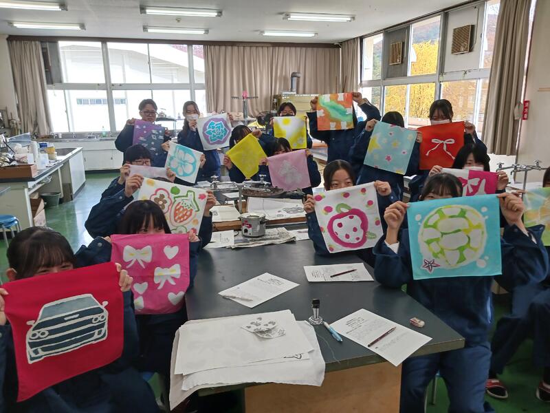 11月18日(火)、創造技術科・染織デザインコース2年生の専門学科講師授業で「蝋染めワークショップ」が行われました。講師は奈良芸術短期大学・染織コースの近藤卓浪先生です。桐工では蝋染めの実習は行わないので、どんな仕上がりになるか、ドキドキでした。結果は…それぞれが考えた色やデザインの鮮やかなハンカチが染め上がりました。遠く奈良からたくさんの染色道具をお持ちいただきご指導くださいました近藤先生に感謝します!